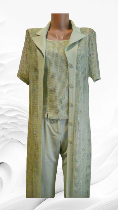 Гарний літній костюм з трьох частин (топік, штани, кардиган) Дуже приємна до тіла тканина. Розмір вказаний 11. Підійде на S і M Колір дуже красивий ніжний фісташковий. Брючки - силует прямий, висока посадка, по талії є резинка. Довгий кардиган - сіточка з ледве помітною люрексовою ниткою. Замеры: Майка-топ - ПОГ - 44 см (тягнеться до 49 см) ПОТ - 40 см (тягнеться до 44 см) Брюки - ПОТ - 32 см (по бокам резинка тягнеться до 36 см) ПОБ - 50 см (тягнеться до 55 см) Посадка спереду - 31 см Посадка сзаду - 38 см Ширина брючин - Верх ПО - 29 см Коліно ПО - 22 см Низ ПО - 22 см Довжина брюк по зовнішньому шву - 111 см Довжина брюк по внутрішньому шву - 83 см Кардиган - Ширина плеч - 39-40 см НОГ - 42 см (в застібнутому стані без натяжіння) НОТ - 41 см (так само) НОС - 48 см (так само) Розрізи по бокам нижче стегна Довжина по спинці - 140 см