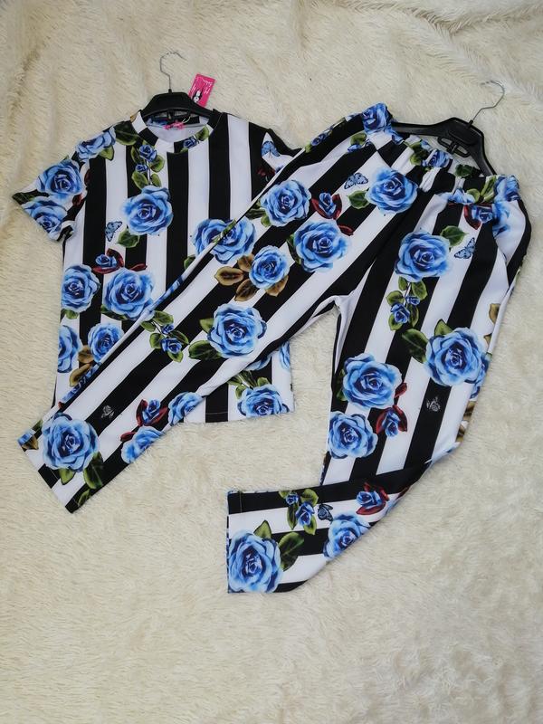 ⛔ красивий яскравий костюм в смужку з квітами укорочені брючки