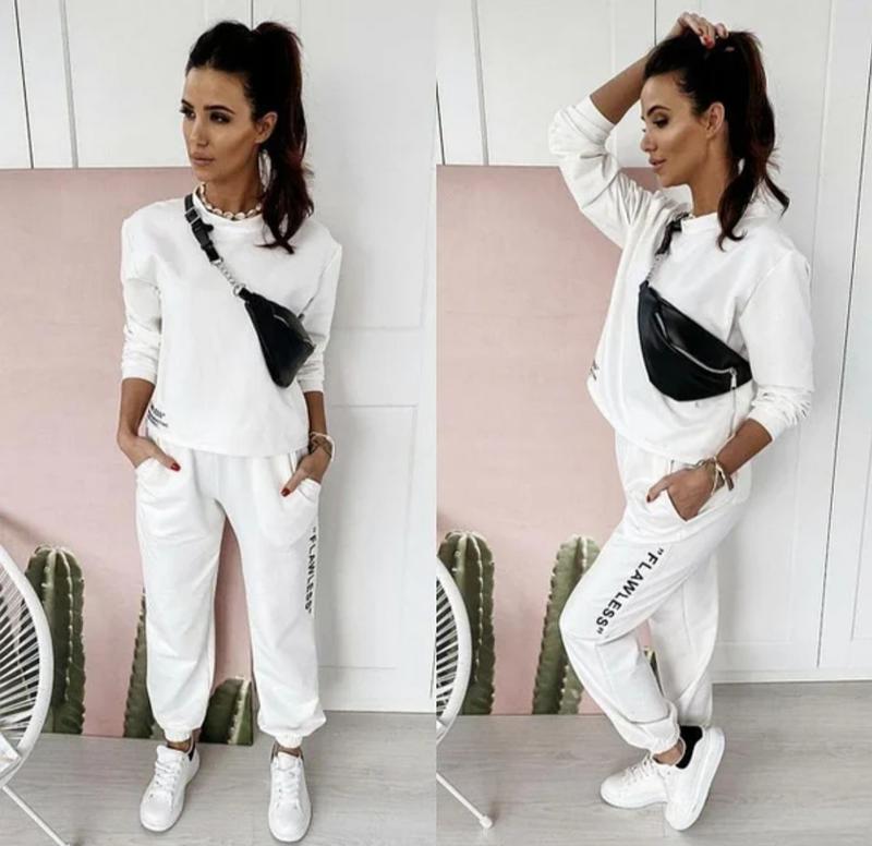 Стильный трикотажный костюм "Flawless" Костюм спортивного стиля – отличный вариант для повседневных прогулок, занятий спортом на открытом воздухе и активного отдыха. Новая модель состоит из двух деталей: Кофта свободного прямого кроя с неглубоким круглым вырезом горловины. Рукава длинные с манжетами. На передней полочке снизу присутствует надпись-накатка контрастного цвета. Спортивные штаны-джоггеры с завышенной талией и поясом на резинке. Изделие имеет три кармана: два боковых спереди и один накладной сзади. Одну из штанин украшает крупная надпись "FLAWLESS". Костюм изготовлен из мягкого трикотажа "двунитка". Ткань практичная в эксплуатации, способна долго сохранять целостность структуры, формы и цвета. Одежду из двунитки можно стирать руками и в машинке, главное соблюдать температурный режим (не выше 30 градусов) и не использовать агрессивных моющих средств. Характеристики Стиль:Casual Сезон:Весна/осень Длина кофты от плеча:53-54 см Длина рукава от плечевого шва:55-57 см Длина бокового шва штанов:95-98 см Длина шагового шва:67-69 см м Материал:Двунитка Таблица размеров Наличие на складе Цвет 42-44 46-48 Черный ✓ ✓ Белый ✓ ✓ Фрезовый ✓ ✓ Хаки ✓ ✓