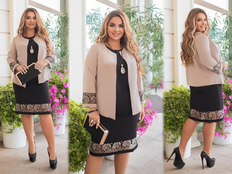 Костюм №1166. Ціна 840 грн Розмір: 50-52, 54-56, 58-60. Колір: електрик, беж, фуксія. Тканина: основа костюмна тканина + 3D гіпюр для Туреччини. Довжина сукні 105 см. Довжина: піджак 65 див, рукав 53 див. Елегантний жіночий костюм складається з жакету та сукні. Жакет напівприлеглого силуету, виконаний з костюмно-платільної тканини. Кругла класична горловина додає образу строгість та елегантність. Виразний контраст створює світлий піджак. Модель красива та практична. У такому костюмі кожна жінка зможе відчути себе справжньою леді! Заміри: РОЗМІР 50-52: Сукня: дл. вид. 105 см ОГ-53 ВІД-52 ОС-55 Піджак: буд. вид. -65 див, рукав -53 див. ОГ-55 РОЗМІР 54-56: Сукня : дл. вид. 107 см ОГ-59 ВІД-55 ОС-60 Піджак: дл. вид 68 см, рук -53 ОГ-60 див. РОЗМІР 58-60: Сукня : дл. вид 110 см ОГ-63 ВІД-60 см ОС-65 см Піджак: дл. вид 71 см, рукав 55 см ОГ-65 см.