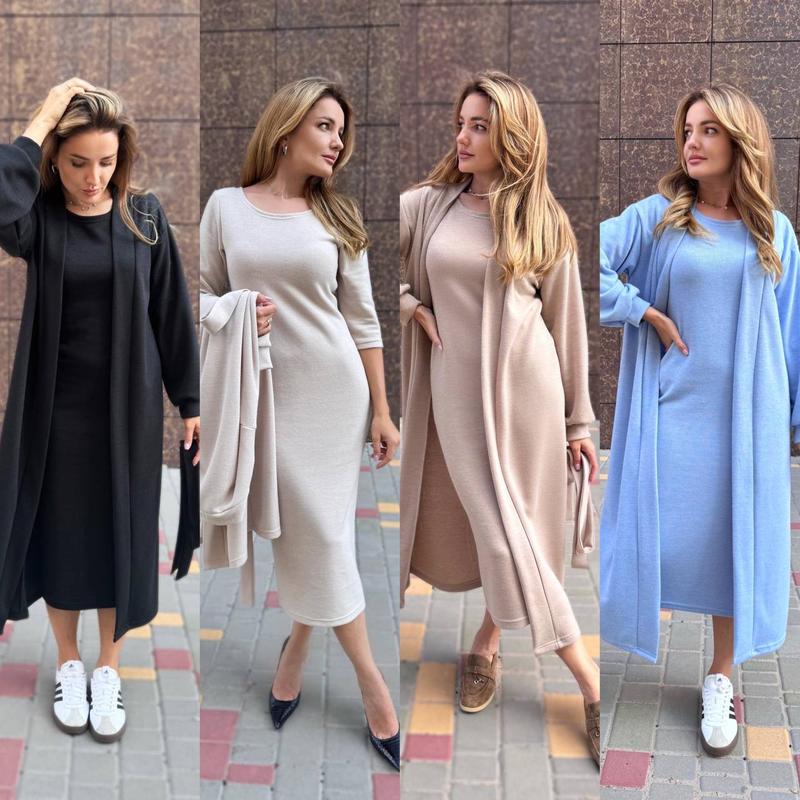 Костюм (сукня+кардиган) Арт 727 Тканина ангора "дабл" Колір чорний, мокко, бежевий (таш), блакитний Розмір 42-44,46-48,50-52 Сукня приталеного крою, рукав 3/4, ззаду внизу розріз Кардиган прямого вільного крою, з широкими рукавами, рукави на манжеті, пояс йде окремо (не пришитий) Тканина мʼяка, не колеться, приємна до тіла