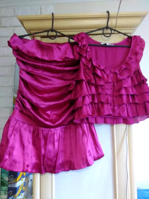 Блузка пог 44 см, довжина 44 см. Полієстер. Сарафан пог 44 см, пос 47 см, довжина 62 см. Натуральний шовк. Збоку молнія. Грудь стрейч. Можна купити окремо, пишіть.