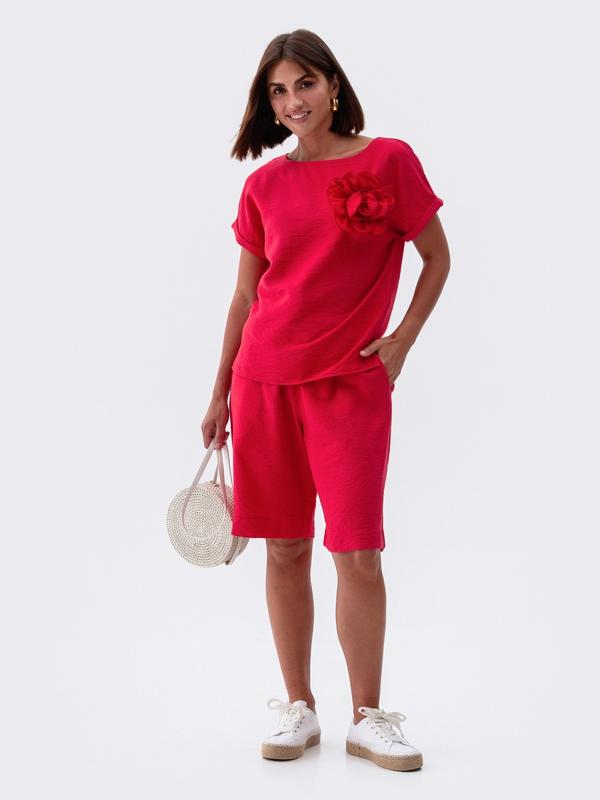 Блузка з вирізом горловини човник і суцільнокроєними рукавами з підворотами. Виріб подовжений по спинці та доповнений розрізами збоку. Декорована брошкою у вигляді квітки (не прати). Подовжені шорти прямого крою. Модель із завищеною талією та поясом у вигляді гумки з куліскою. Для комфорту в носці доповнені кишенями. Розміри: 44,46,48,50,52, 54 Доставка: 💙 Укрпошта (повна передплата) 💛Нова Пошта (повна передплата або накладний платіж з передплатою) ✨Відправка 2-3 робочі дні 🌿Є повернення та обмін