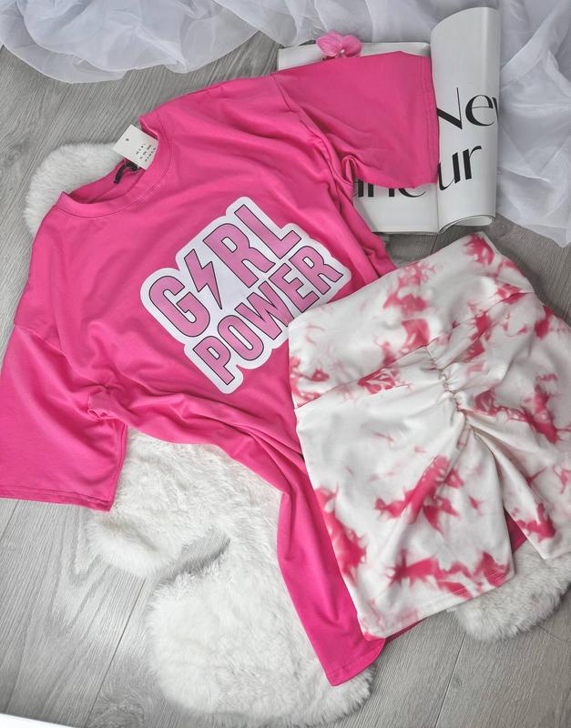 Жіночий костюм літній шорти з ефектом тай дай пуш ап і футболка girl power рожевий