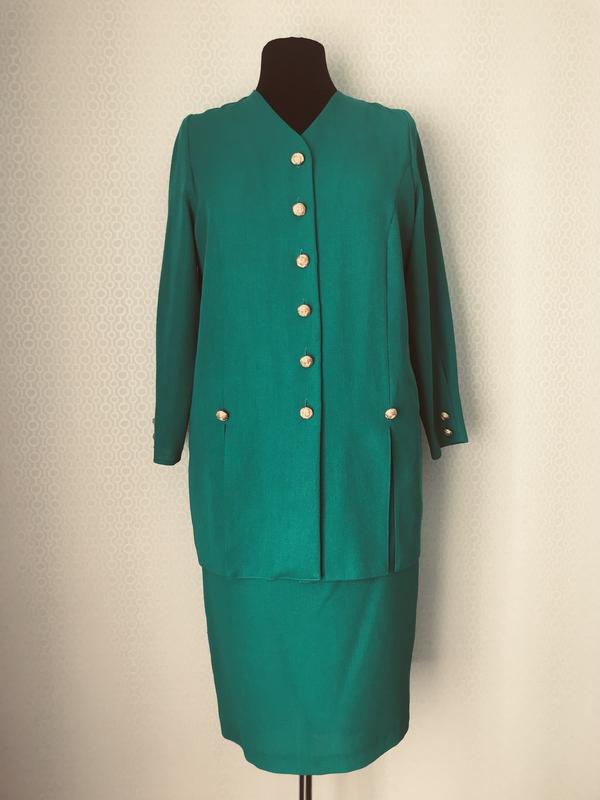 Класний комфортний трикотажний костюм дуже красивого насиченого зеленого кольору. Складається з довгого жакета та класичної спідниці олівець. Тканина схожа на трикотаж (і візуально, і тактильно), але не тягнеться, як зазвичай трикотаж. Жакет-V — подібний виріз горловини, без коміра, застібається на 6 нереально красивих золотистих металевих ґудзиків, подібний до троянди, ще два ґудзики над розрізами спереду та по дві на рукавах. Без кишень. Без підкладки. Спідниця — застібається на блискавку ззаду. Ззаду не глибокий розріз. На підкладці. Заміри жакета в нерозтягнутому вигляді, см: плечі 41, пахви (приблизно дорівнює НОГ) 61, ПОТ 59, НОС 61, довжина 88, довжина рукава 60. Заміри спідниці в нерозтягнутому вигляді, см: НОТ (по поясу) 47, тягнеться до 50, НОС 58, довжина 71. Об'єми манекена, см: плечі 43, ОГ 111, ОТ 90, ОБ 114 Вирушаю Новою поштою або накладеним платіжом (за умови оплати доставки в обидва кінці), або за передоплатою на карту Приват, Укріплого за передоплатою JUSTIN за передоплатою Продаю багато фірмових речей Airfield, Strenesse, Gerry Weber, Steilmann, Brax, Bonita, Basler, Frank Walder, Apanage, Olsen, Ulla Popken, Gardeur, Monari, Rabe, Guess, Hauber, Marks&Spencer, Concept K. Багато нових речей (з етикеткою) — можна на подарунок. Дивіться інші свої оголошення. Завдяки тому, що зазирнули:-)