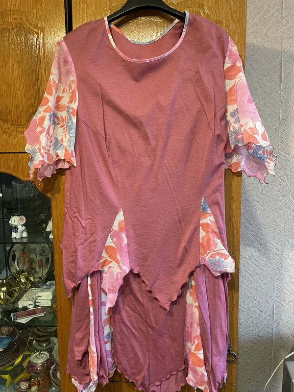 Трикотаж та батист. Пог 55, довжина 65/77, плече 12, рукав 24/33. Спідниця довжина 76/86, пояс 48, на підкладці , виглядає нарядно