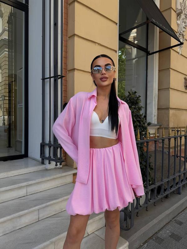 Фото вживу 😍 Костюм 2-ка🌸 ▫️Модель 488bot ▫️Тканина: креп жатка🕊️ ▫️Колір: розовий, блакитний, беж. ▫️Розмір: 42-44, 46-48 🫶🏽Стильно та кайфово, oversize сорочка та спідничка.