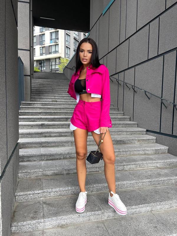 Костюм ▪️Модель: 244 ▫️Розмір: S-M; M-L ▪️Тканина: котон ▫️Колір: чорний; білий; малина 🔝 Бути елегантною не означає впадати у вічі, це означає врізатися в пам'ять 😉 Укорочена куртка та шорти 🫶