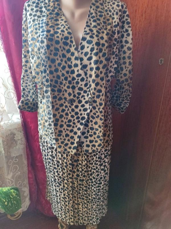 Стан дуже хороший., тканина віскоза та поліестер.Тонка, трохи тягнеться.Обирайте у подарунок до будь-якого замовлення.Є нюанс, на останніх фото показала.Сама ледь розгледіла ,видно від праски.А так стан ідеальний.Можна вдягати просто спідницю.Кардиган:пог-57см,пот-52см, довжина рукава від горловини -56см.Спідниця:пот-28см(68), довжина виробу -71см.Є ще багато чого цікавого, підписуйтесь на оновлення, майже кожного дня.