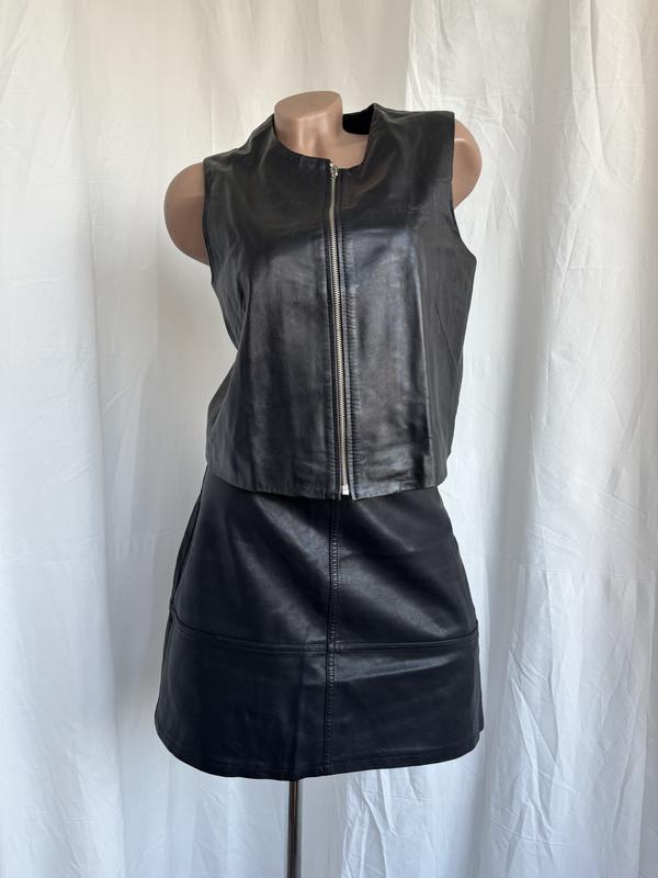Костюм збірний Жилет шкіра натуральна EU38 Бренд не вказано У відмінному стані , трохи стерта на згині під пахвами, враховано в ціні Шкіра м'яка Довжина 49 ПОГ 48 ПОБ 47 New Look EU 40 UK12 Спідниця міні Екошкіра, дуже схожа на натуральну У відмінному стані Довжина 43 ПОТ 40