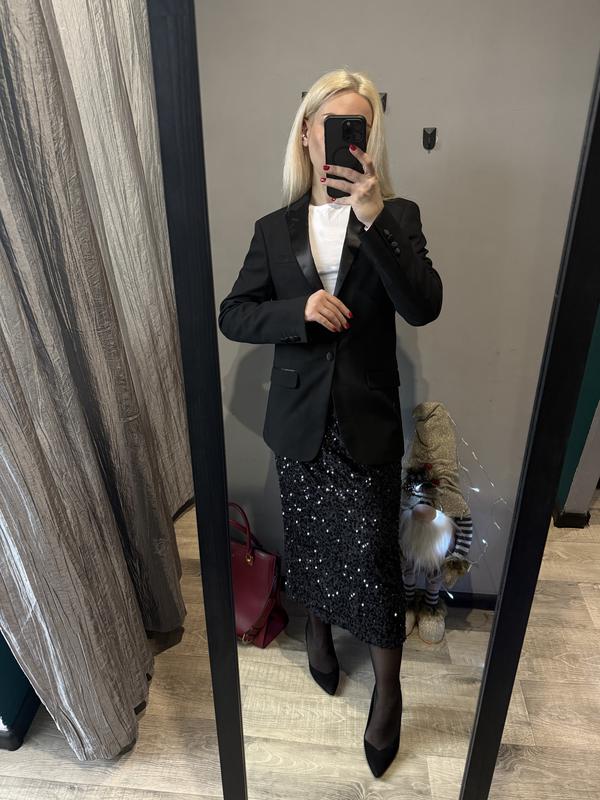 • Комплект • Комплект - жакет та спідниця. Жакет на підкладці, з підплічниками. Має атласні елементи, які додають святкового вигляду: лацкани, кант над карманами та ґудзики - центральний і на манжетах. Спідниця - оксамит, обшитий чорними паєтками. В талії на гумці. Ззаду має розріз. Підійде на розмір: S/невелика М Стан нового. Заміри: Жакет: пог - 49; пот - 42; довжина рукава - 64; довжина - 70. Спідниця: пот - 32 (максимум - 52); пос - 47 (максимум - 55); довжина - 81.