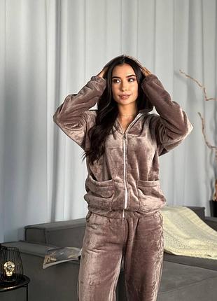 Жіночий домашній махровий костюм теплий і приємний до тіла кофта на замку з капюшоном і штани широкі