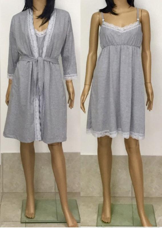 Комплект для беременных и кормящих мам с расстройкой на бретели и регулятором высоты. Длинный рукавчик. Для утонченности силуэта на спинке в районе талии на халате вставлена мягкая резинка, пояс пришит. Халат с карманами. Халат и ночная декорирован круживом. Полотно кулир-меланж(100% хлопок), практически не дает усадку. В в наличии в размерах 42 по 54