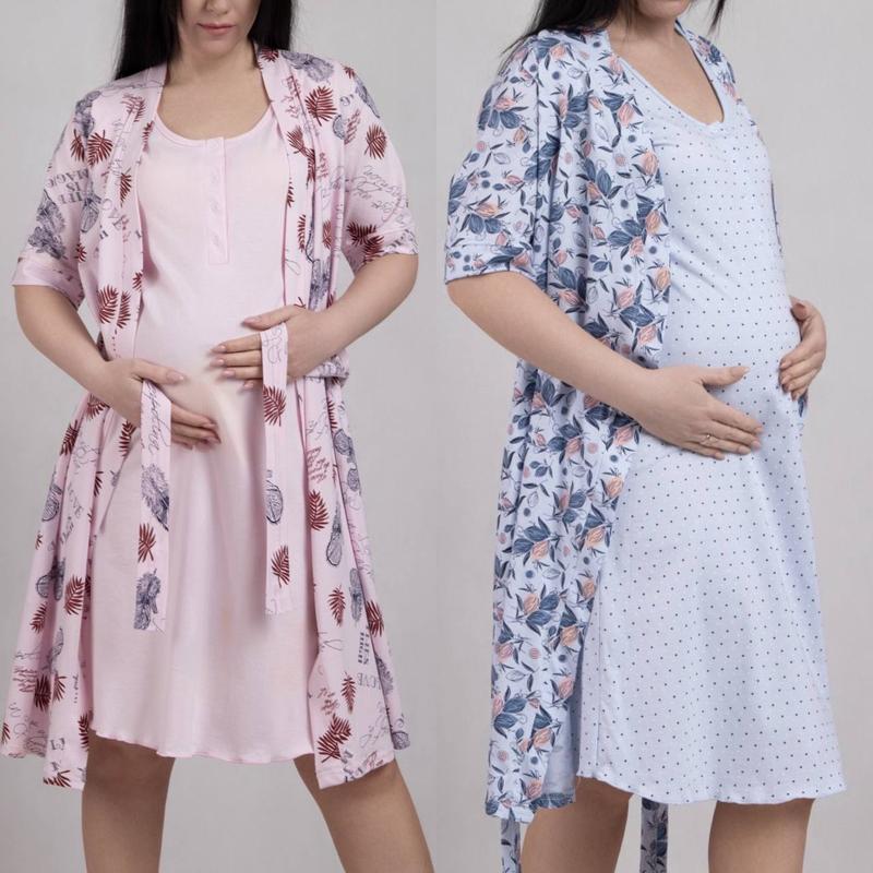 Халат на запах має дві кишені та поясок. Нічна з планкою на широких брителях, що зручно для майбутніх і годуючих мама. Полотно кулір (100% бавовна). Набір чудово підійде для вагітних і для годуючих жінок. Розмірний ряд 44, 48, 52, 56, 60. Прання : 30-40 градусів. р.44/46-630 грн. р.48/50-655 грн. р.52/54-680 грн. р.56/58-700 грн. р.60/62-730 грн.