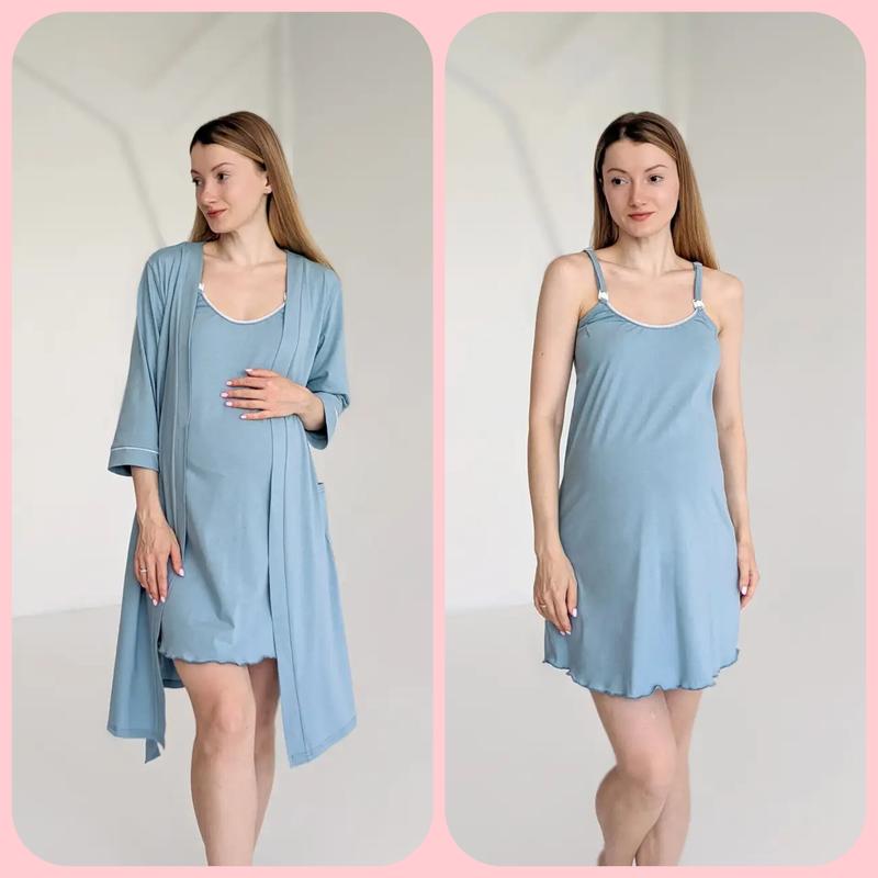 Халат и ночнушка с клипсами для кормления. Такой комплект будет удобен на любом сроке беременности и после родов. Детали: халат средней длины, на запах с поясом, рукав 3/4, два накладных кармана. Рекомендуется деликатный режим стирки при температуре не выше 30 градусов. Глажка только с изнаночной стороны. Стирать с вещами подобных оттенков или по отдельности. Ткань: кулир. Состав: 100% хлопок. Цвет: ментоловый 🩵 Размер: 42-44,46-48,50-52,54-56,58-60 в наличии. Цена 920 грн. 💟 Поможет в каблуке размера 💟 Доставка УкрПошта та НоваПошта 💟 Повна передплата на картку Для заказа пишите в Директ