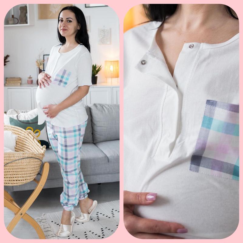 Пижама для беременных мам футболка со штанами. Стильная пижама для будущих мам, футболка свободного кроя с секретом для кормления (планка на кнопках). Брюки с высокой посадкой на мягкой резинке. Полотно брюк турецкий кулир (реактив), футболка турецкий кулир, состоит на 100% из хлопка. Полотно мягкое и приятное к телу, при стирке не дает усадки, при условии соблюдения температурного режима 30-40 градусов. Размеры: 44-46 48-50 52-54, полномерные на фото девушка в 44 размере роста 167 см. 44/46 объем груди 96см объем бедер 100см Длина футболки 59 см 48/50 объем груди 104см объем бедер 107 см 52/54 объем груди 108 см объем бедер 114см Цвет: клетка/молочный 🟦🤍 Размер 44-46,48-50,52-54 в наличии. Цена 320 грн 💟 Поможет в каблуке размера 💟 Доставка УкрПошта та НоваПошта 💟 Повна передплата на картку Для заказа пишите в Директ