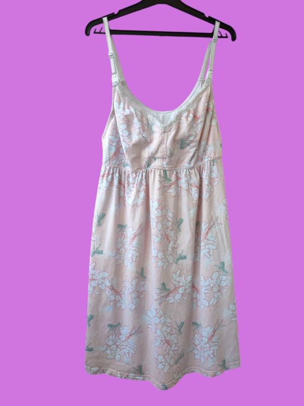 Ночная рубашка для беременных и кормящих матусь (размер L) в очень хорошем состоянии. Рубашка из красивой износостойкой ткани, приятной к телу, на лямках, которые расстегиваются и регулируются для удобства. Склад: 95% бавовна, 5% еластан Замеры: Обхват грудей: 100-104 см Обхват стегон: 104-108 см