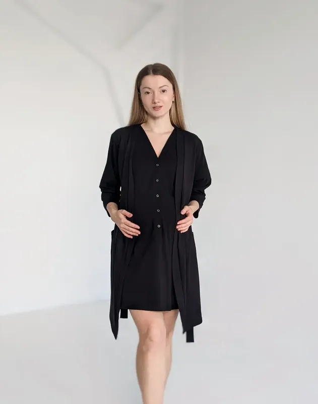 Комплект состоит из халата и рубашки в родовую залу. Пошит из легкой хлопковой ткани, не парящей и приятной к телу. Детали: рубашка на короткий рукав, А-силуэт, свободный крой, удлиненная планка на кнопках; халат средней длины, на запах с поясом, рукав три четверти, два кармана. Размер: 42-44, 46-48, 50-52, 54-56, 58-60 Материал: 100% хлопок