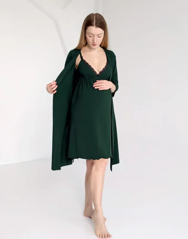 Халат и рубашка украшены кружевом. Такой комплект будет удобен на любом сроке беременности и после родов. Детали: рубашка с формованным лифом, тонкие бретельки с регулятором длины, клипсы для ГВ, "юбка" А-силуэта; халатик средней длины; рукава три четверти, с декорированием; на запах, с поясом; два накладных кармана. Размер: 42-44, 46-48, 50-52, 54-56 Материал: 95% хлопок, 5% эластан