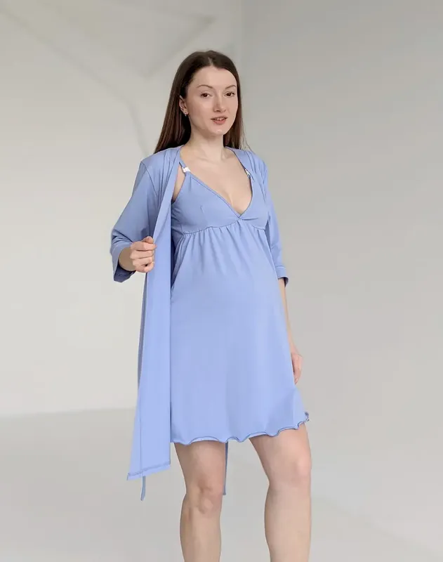 Комплект будет удобным на любом сроке беременности и станет незаменимым помощником после родов. Детали: рубашка с формованным лифом, тонкие бретельки с регулятором длины, клипсы для ГВ, "юбка" А-силуэта; халатик средней длины; рукава три четверти; на запах, с поясом; два накладных кармана. Размер: 42-44, 46-48, 50-52, 54-56 Материал: 95% хлопок, 5% эластан
