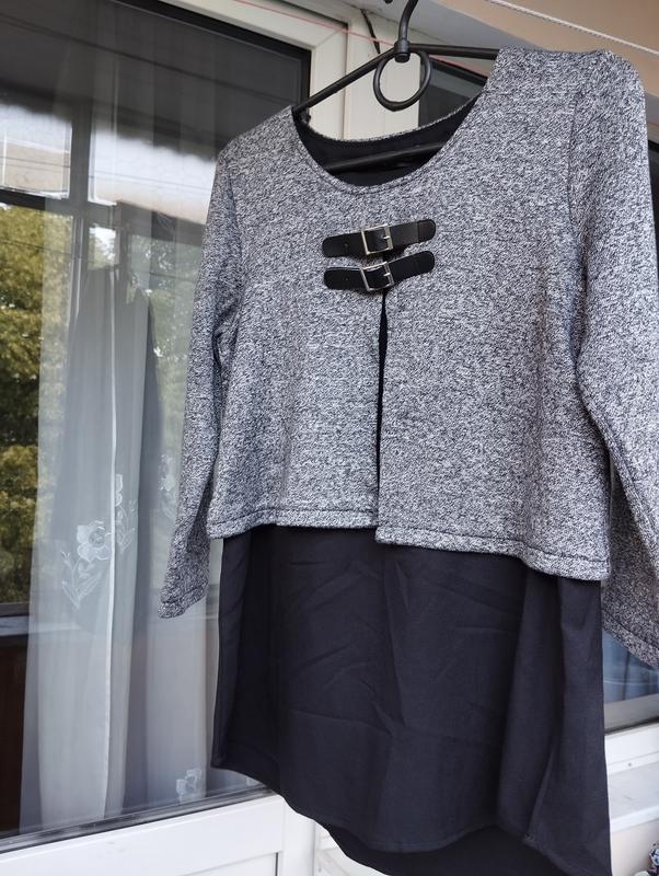 Свободная кофта, внизу имитация рубашки. Широкий низ, ремешки на груди можно распустить, там есть еще одна дырочка. Указан размер L, но за счет свободного низа можно на меньший и больший размер. Без недостатков, только потерянная нижняя бирка. Длина по спине 42 см Полуобхват груди около 47 см. Рукав 48 см.