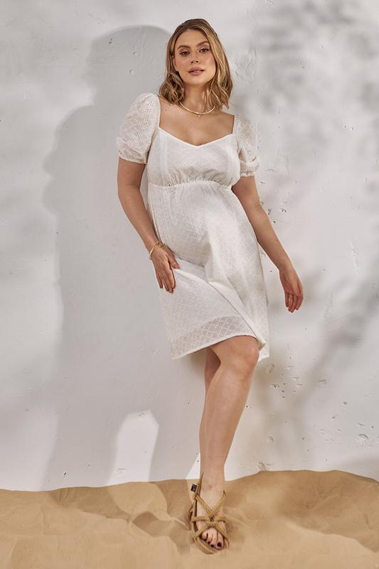 Платье для беременных и кормящих с акцентными рукавами-буфами. Силуэт: облегающий лиф юбка-колокольчик с присборкой. Стиль: нарядные. Секрет кормления: тайные молнии в нагрудных рельефах. Тканина: прошва. Растяжимость: ткань при носке увеличивается 2%. Цвет: белый. На фотографии: размер модели L, объем груди 96 см, бедер 101 см, рост 171 см. Ориентировочные измерения готового изделия: S: Длина по спинке от 7-го шейного 95 см, Длина рукава 34,4 см, Грудь 90 см, Талия 104 см, Бедра 122 см. M: Длина по спинке от 7-го шейного 96 см, Длина рукава 34,5 см, Грудь 95 см, Талия 109 см, Бедра 126 см. L: Длина по спинке от 7-го шейного 97 см, Длина рукава 34,7 см, Грудь 100 см, Талия 114 см, Бедра 130 см. XL: Длина по спинке от 7-го шейного 99 см, Длина рукава 34,8 см, Грудь 105 см, Талия 119 см, Бедра 134 см. Усадка изделия после первой стирки по длине до - 4 см. Состав: 100% Cotton.