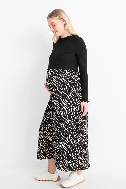 Cтильна сукня для вагітних у сучасному поєднанні зручності та елегантності. Верх виконаний із чорного трикотажу в рубчик з довгими рукавами та делікатною хвилястою обробкою по краю. Нижня частина — спідниця вільного крою з м’якої тканини з анімалістичним принтом у чорних та бежевих відтінках. Висока посадка забезпечує комфорт для животика, а довжина міді створює витончений силует. Ідеальний варіант для щоденного образу — поєднується як з кросівками, так і з чобітками.