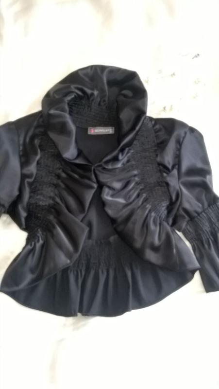 Красивенное болеро чёрного цвета из плотного атласа,Размер 44-46.Ширина по спине-33,длина-39,5,длина рукава-31.Состояние новое,один раз пришлось одеть.