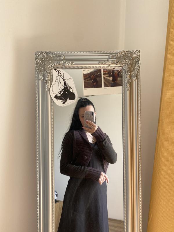 В жизни ближе к корчневидному, очень теплому болеро, без дефектов, размер М, приобретался в Англии