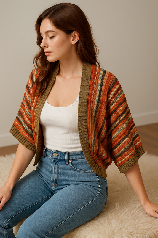 Вязанная короткая накидка-болеро безрукавка в принт George размер L/XL Состав: - 92% акрил - 8% нейлон Хорошо тянется, состояние новое! Замеры: - длина от плеча по спинке 55 см - рукав от горловины 50 см - ПОГ от 49 см ( тянется максимум до 55 см)