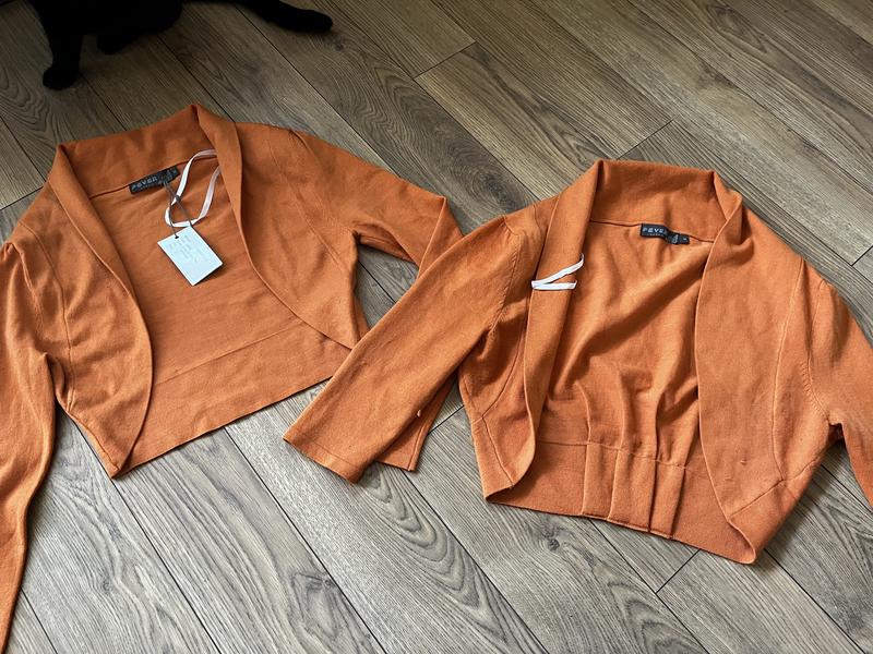 ПОГ 41 см, довжина 37см , рукав від плеча 61 см нова з нюансів є затяжка зробила кішка при носці її не видно ціна 300 грн розмір 12 ; Інша болеро має розмір 14 на пів обхват грудей 48 довжина 39 так як кішечка попрацювала і наробила багате но затяж ок її ціна 120₴