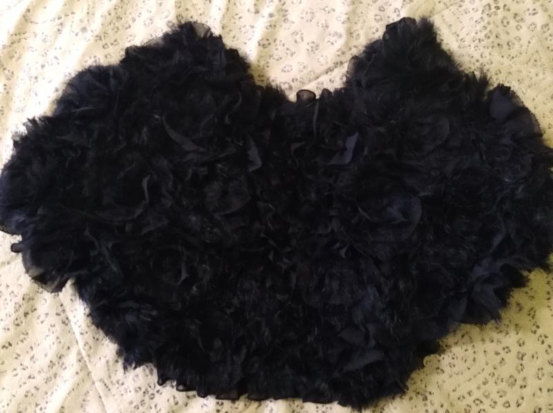 Болеро коротке чорне з текстилю та хутра кролика оформлених у вигляді троянд. Зсередини гіпюр. Тягнеться. Є два розрізи для рук.