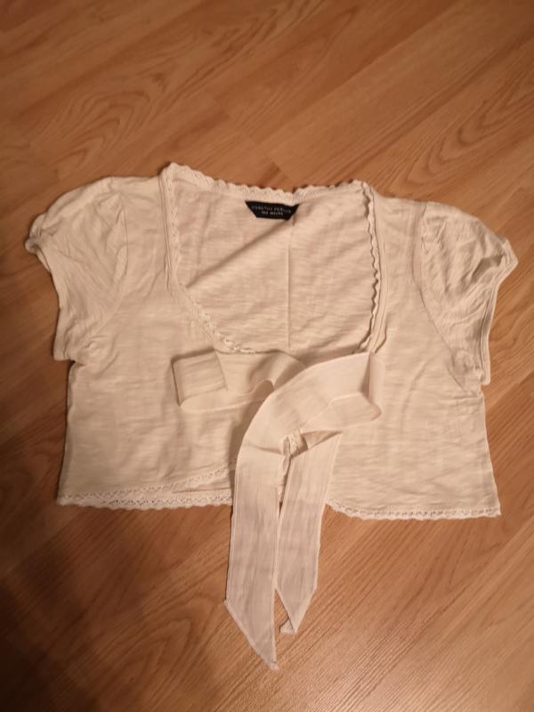 Легкое болеро, спинка 33, плечи 34 см, рукав 13 см, подмышки 42 см, низ 41 см лента ширина 4 см, длина 5е см.
