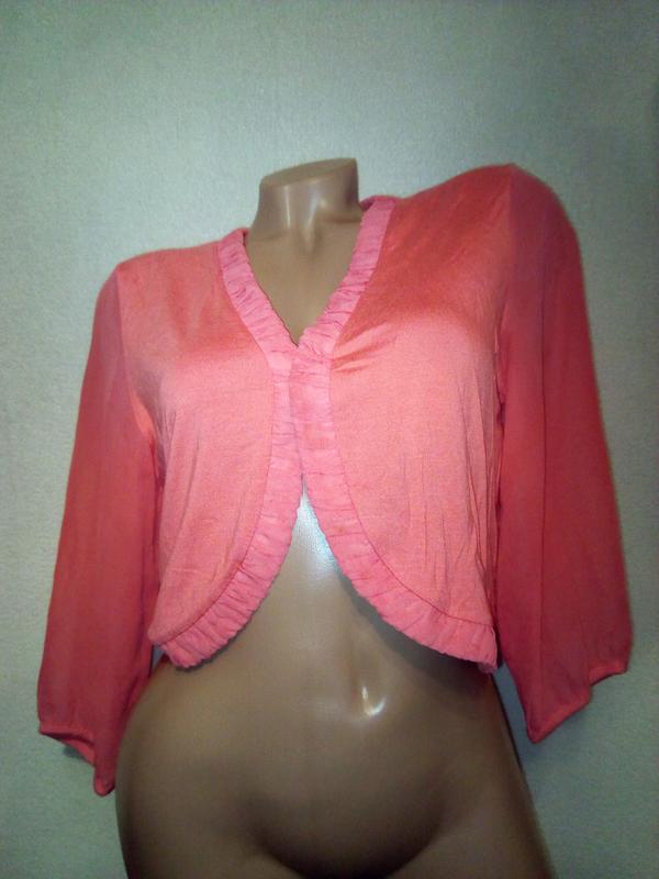Модное женское болеро,рассчитано на 44-46 р.Цвет коралл.Рукав идёт 3/4.,( сделаны из другой ткани ,по типу шифона).Дефектов нет.Замеры по просьбе