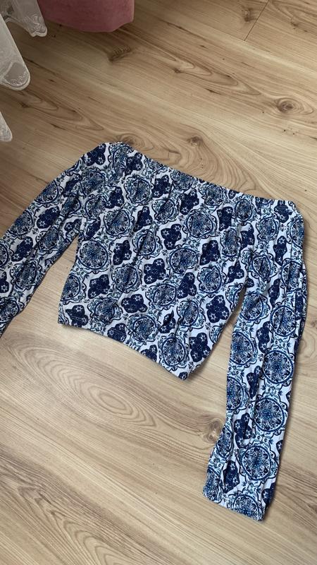 Вкорочена кофтинка на плечі в цікавий принт. Рукавички вільні внизу на гумках.