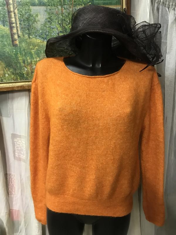 Шикарный джемпер от французского бренда American Vintage. Яркий цвет апельсина, удачная модель, очень красиво оформлена горловина. Шикарный состав:мохер/шерсть/полиамид/эластан (34/34/29/3). Размер по бирке-S. Отличный!