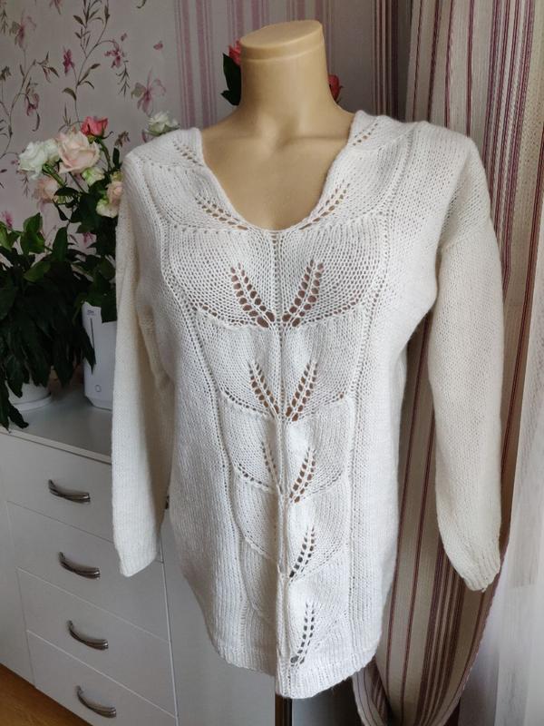 Ажурні ЛИСТОЧКИ шерстяний молочного кольору в р. Повний М, невеликий Л Довжина 64 Пог 51 Рукав спущений від горловини 63.5 Виріз 17