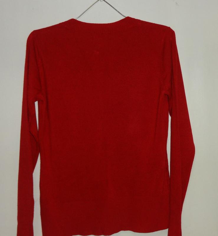 джемпер с длинным рукавом Размер 46 - 48, неяркий красный цвет. Очень приятный в прикосновении материал. У-образный вырез, плотный трикотаж. Немного тянется. Джемпер хорошо держит форму. Полуобхват груди 52 см, полуобхват талии 45 см, полуобхват бёдет 48 см. Длина 63 см. Длина плеча 14 см, длина рукава 66 см. Состяние идеальное, без дефектов. Оплата на карту Приватбанка. Лот не подлежит возврату.