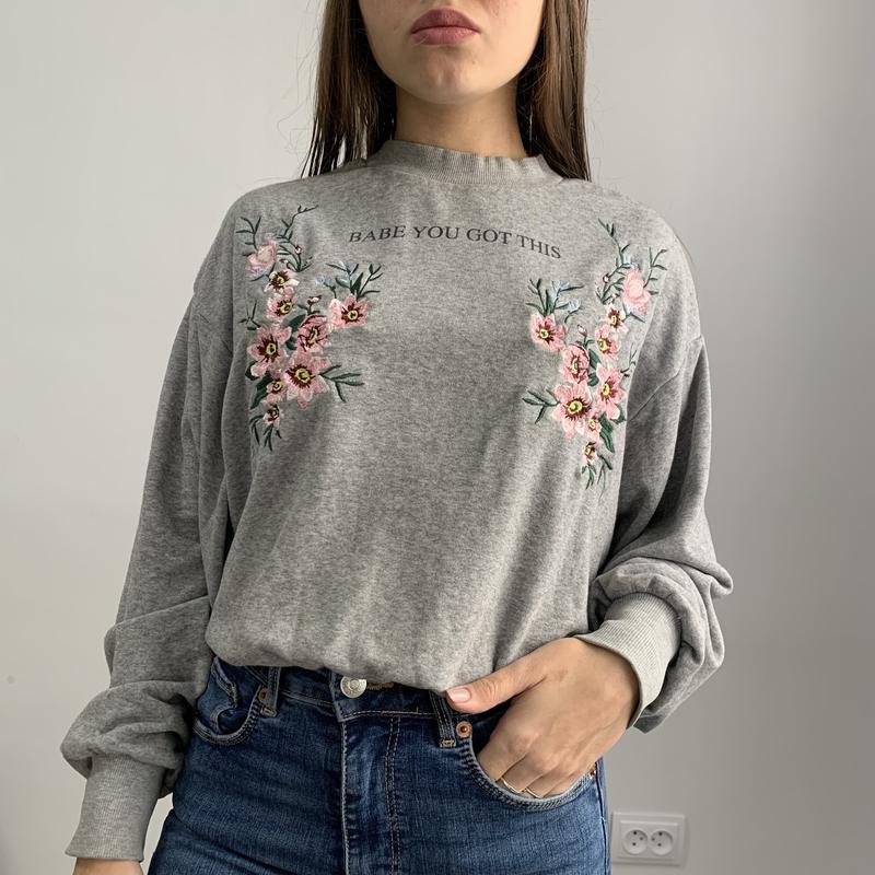 Кофта Tally Weijl, сірого кольору з вишитим принтом, тканина приємна до тіла, на рукавах є резинки та на талії теж резинка. Стан хороший. Вільного крою Плечі 50 ПОГ 50 Довжина рукава 51 Довжина 49