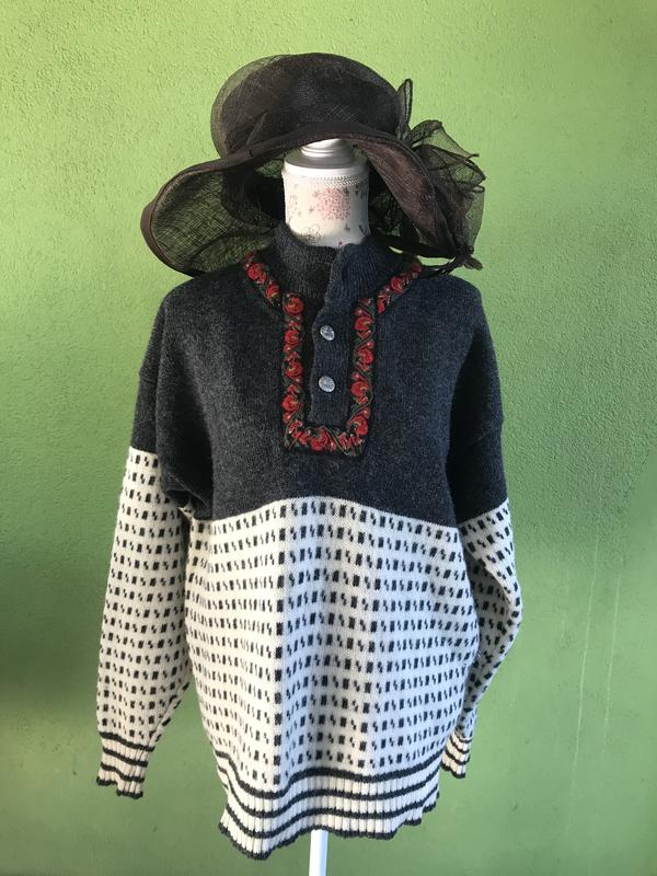 Шикарный винтажный джемпер из норвежской шерсти. Оверсайз! . Размер по бирке Xl. Замеры: длина -69 см, ПОГ-54 см, ПОБ-50 см, рукав от ворота-75 см. Утеряна одна пуговица.очень красивый!