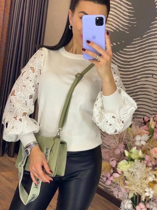 ШИКАРНА КОФТИНКА ВІЛЬНОГО КРОЮ З КРУГЛИМ ВИРІЗОМ НА РЕЗИНЦІ ВНИЗУ І НА РУКАВАХ ДЕКОРОВАНА ЕФЕКТНИМИ ОБ'ЄМНИМИ РУКАВАМИ З МЕРЕЖИВА З ЧАРІВНИМ ВІЗЕРУНКОМ КОФТОЧКА ВІДМІННО ВИГЛЯДАЄ, ВОНА ПІДІЙДЕ ДЛЯ РОБОТИ В ОФІСІ, ДІЛОВОЇ ЗУСТРІЧІ, НАВЧАННЯ І ДОЗВІЛЛЯ РОЗМІР УНІВЕРСАЛЬНИЙ 42-46 ДОВЖИНА ВИРОБУ 58-60 СМ КОД 2102