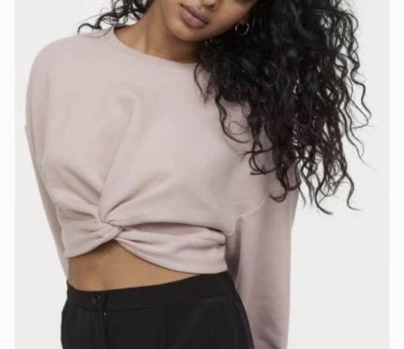 Короткий джемпер з м'якого футера з довгим рукавом і рельєфними трикотажними манжетами. Поличка трохи вкорочена, знизу вузол. Виворіт з м'яким начосом.