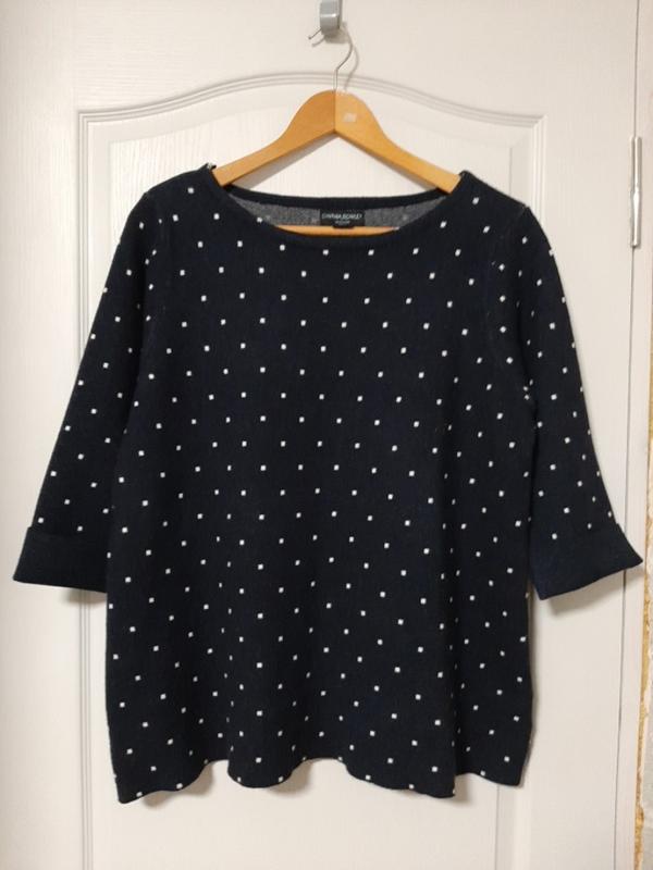 джемпер женский, темно, темно-синего цвета с белыми маленькими кубиками расширеный к низу, рукав 3/4. толстенький и очень мягенький. замеры: пог-60, поб-70, длина рукава с плечом -52 , длина-70
