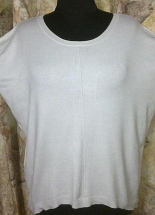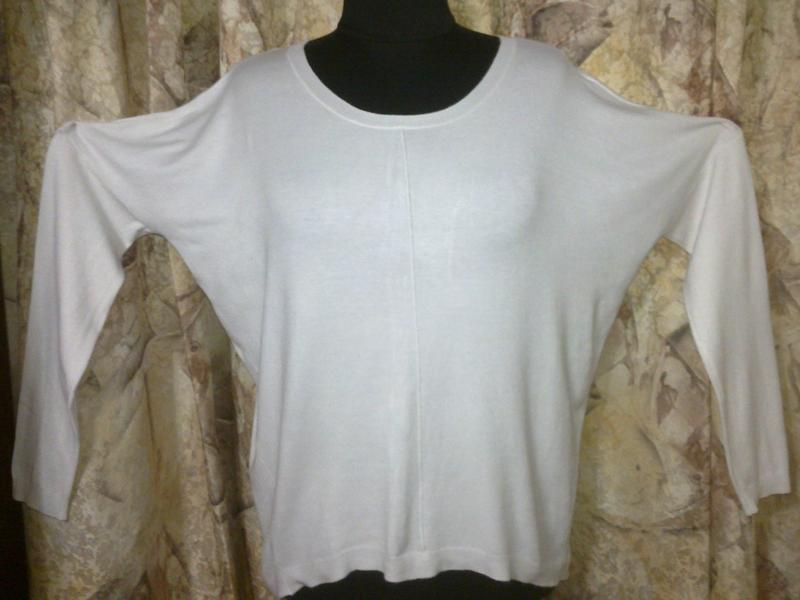 Классная, стильная кофточка-туника, светло-молочного цвета, почти белый, имеет удлиненный, свободный фасон-трапецию, с заниженной проймой рукавов, которые отрезные, ниже проймы и к низу, заужены. Сзади, вдоль, по центру, имеет метал.молнию, которая расстегивается. Сзади, часть заниженная, по отношении к передней. Вырез округленный, с трикотажной резиночкой. Изготовлена в Европе, основные бирки срезаны. Из 100%вискозы, приятный, мягкий, тепленький, натуральный, вязанный трикотаж, тянется, слегка. Размер от 50 до 54, состояние очень хорошее. РАЗМЕРЫ: ПОГ.=67см, ПОТ.=59см, ПОБ.=60см, Длн.издл. по спинке=71см, Длн. рукв. от выреза=75см, от подмышки=45см. ЛОТЫ КОМБИНИРУЮ!!!