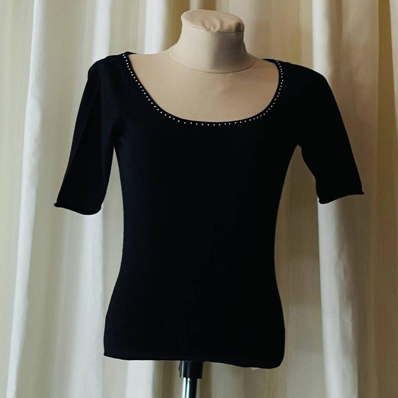 Кофта чорного кольору з декором бусинами TM MANGO🛍❤️🔥😍😍😍 Розмір - UK 8/ EUR 36/ S / 42-44. Склад : 70% віскоза , 30% поліестер . Виробник Китай . Кофта довжиною злегка за лінію таліі . Круглий виріз горловини прикрашений бусинами сірого кольру . Короткий рукав. Середньої товщини трикотаж . Додаткові заміри : повна довжина 53 см ( з них манжета низу 6 см), ширина плеч 34 см , довжина рукава 28 см, напівобхват грудей 40 см ( повний обхват 80 см ) і тягнеться до 100 см, напівобхват талії 35 см ( повний обхват 70 см) і тягнеться до 90 см, напівобхват стегон 36 см ( повний обхват 72 см) і потягнеться до 100 см.