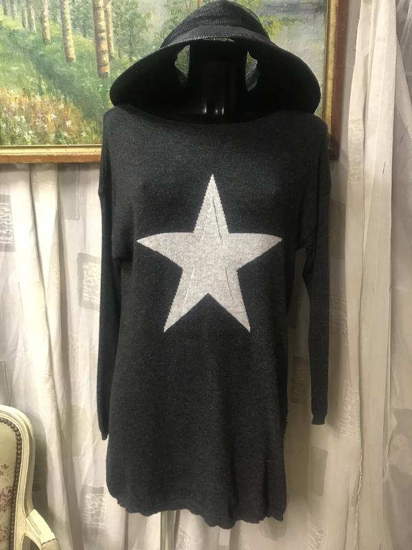 Удлиненная модель, красивая горловина-лодочка. Цвет-темно-серый, звезда-светло-серая. Состав:кашемир/шерсть (50/50). Очень нежный и тоненький. Бирка с размером отсутствует, замеры: длина по спинке-79 см, ПОГ-47 см, ПОБ-49 см, рукав от ворота-66 см.