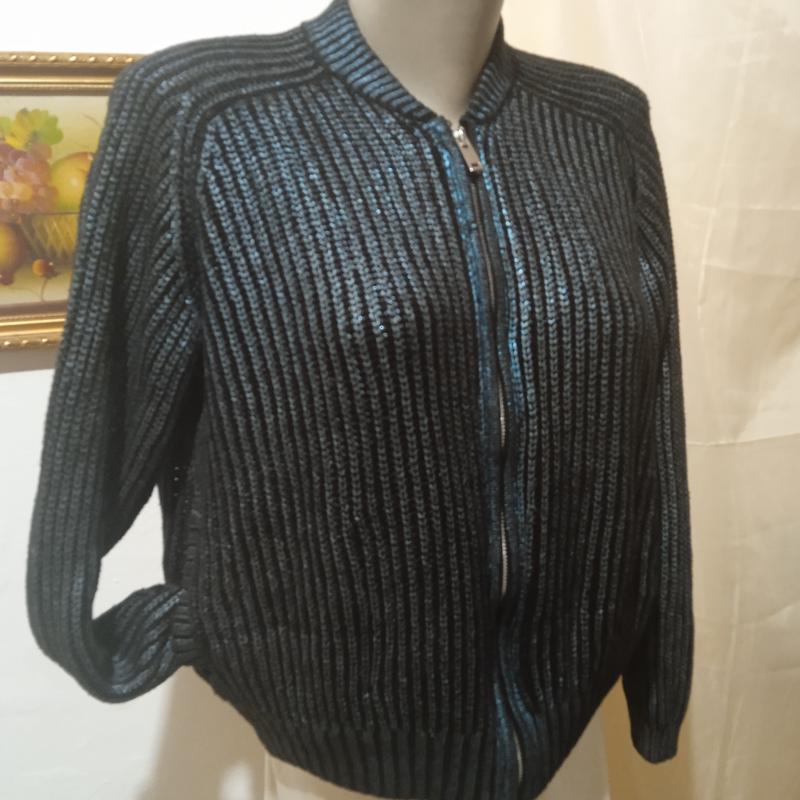 Новая . Шикарная кофта. Стиль спортивный ,продольные карманы. Примеряли на 46 размер села красиво. Плечи реглан. От ворота длина рукава 73 Грудь 60 Длина 46