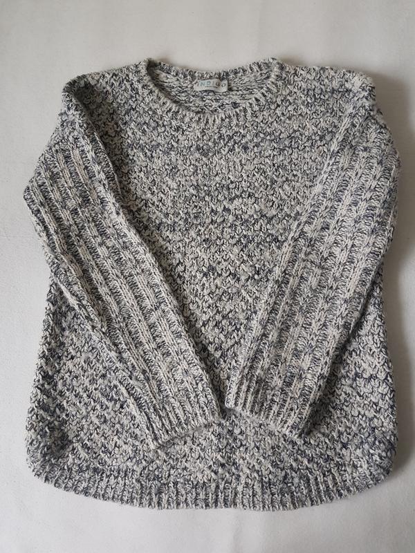 Теплый джемпер, меланжевая нить, фасон-спущенное плечо, обхват груди 96см, длина рукава 54 см, длина 56 см, без дефектов.