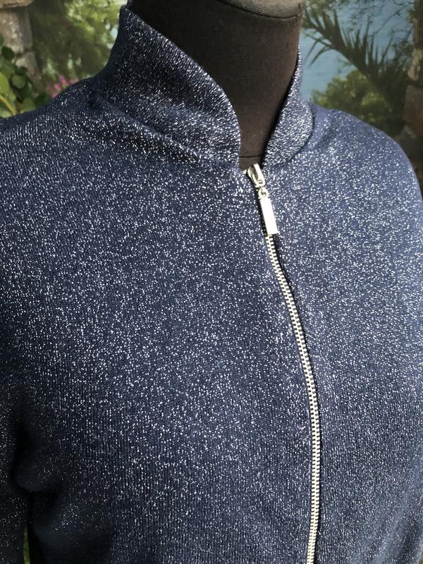 Довжина 56 см, НОГ 47 см. За рахунок поеднання темно синього кольору і сріблястого люрексу дуже класно виглядає. Приємна до тіла.