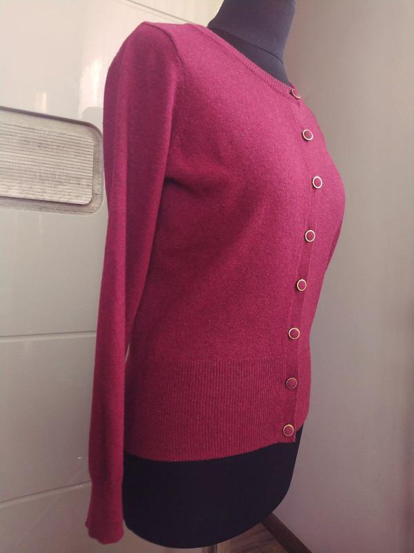 Тоненька приглушено бордова кофта Monsoon. На фото, колір не передався. Він значно спокійніший, більш природній. Гарні гудзики із матеріалу кофти. Гарний стан. Підійде на розміри S, M У складі 6% кашемір, 7% ангора, 27% віскоза, 28% нейлон, 32% котон Довжина 58 см, ширина під пахвами 47 см далі трохи звужується, плечі 9 см, рукава 61 см Є нюанс на спинці - останнє фото.
